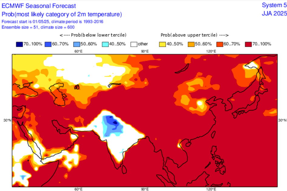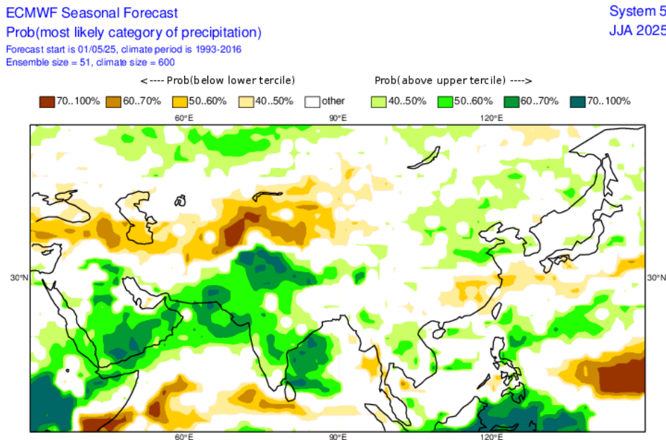 Temperature and precipitation outlook for Summer 2025 in Asia from ECMWF. Source: https://charts.ecmwf.int/