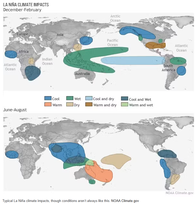 La Nina weather patterns across the world in winter and summer months. Source: https://theconversation.com/la-nina-is-coming-raising-the-chances-of-a-dangerous-atlantic-hurricane-season-an-atmospheric-scientist-explains-this-climate-phenomenon-228595
