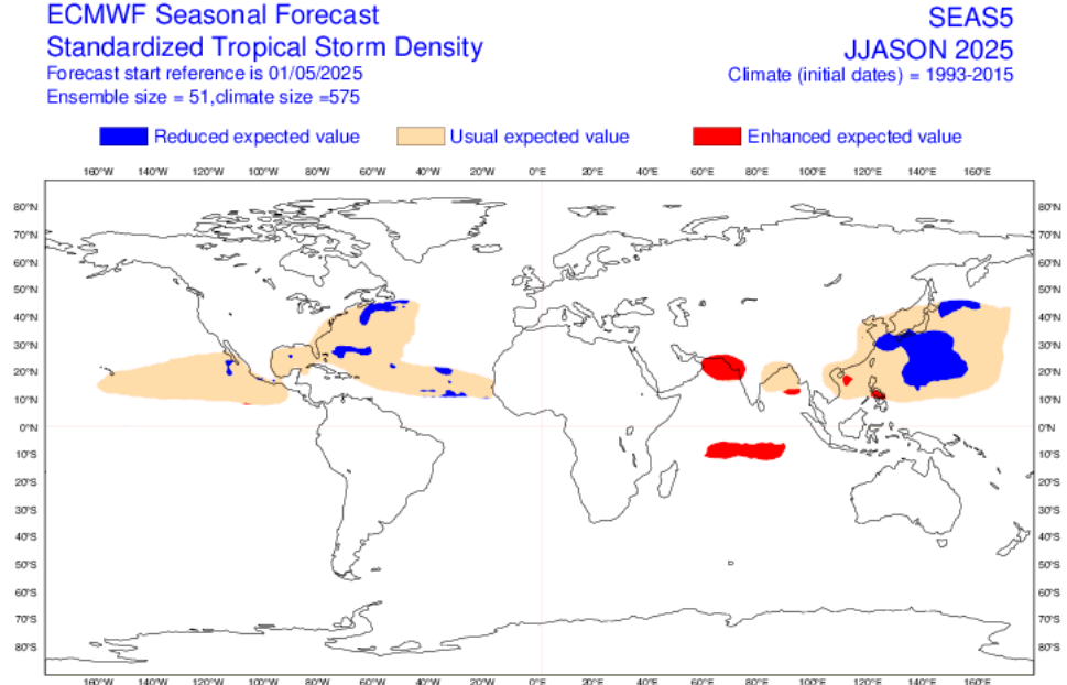 May 2025 forecast od tropical activity for the next half-year. Source: https://charts.ecmwf.int/products/seasonal_system5_tstorm_density_standard?base_time=202505010000