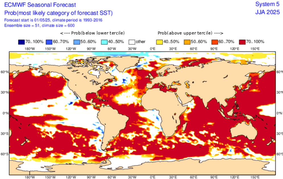 SSTs predicted in Summer 2025. Source: https://charts.ecmwf.int/products/seasonal_system5_standard_ssto?area=GLOB&base_time=202505010000&stats=tsum&valid_time=202506010000