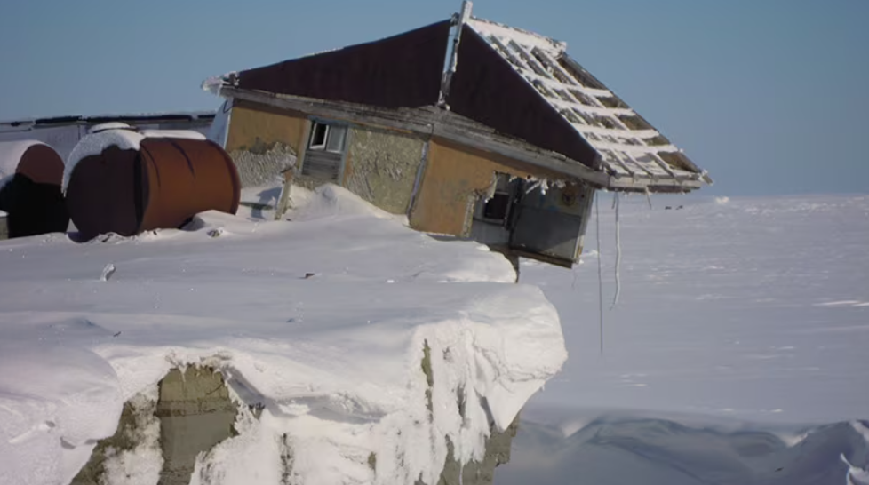 Vize island weather station shifted due to melting permafrost. Source: https://www.climatechangenews.com/2016/08/11/in-pictures-russian-weather-station-on-the-edge-of-melting-permafrost/