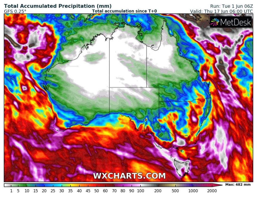 The next floods should until 17. June appear along western coast of New Zealand, while many parts of Australia will be very dry.