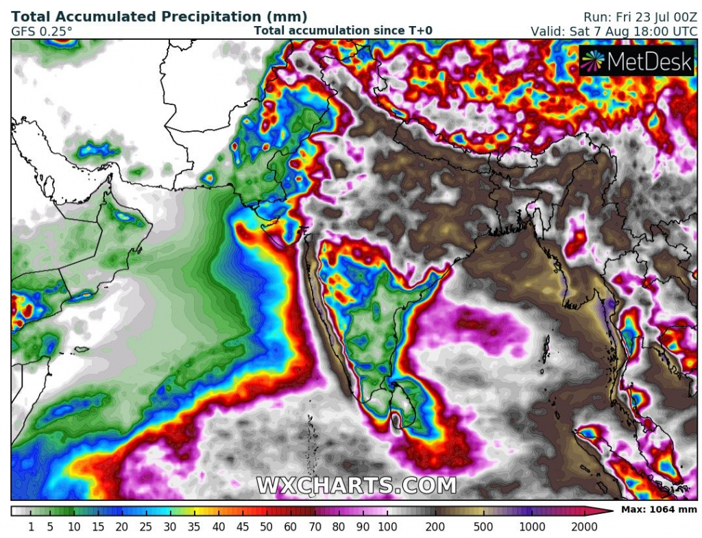 According to current forecasts, the next heavy rainfall, regionally over 1000 mm / 2 weeks are forecasted for parts of northern India, Kerala coast, Bangladesh, Nepal, Myanmar and storms will be continuing in northern Pakistan, too.