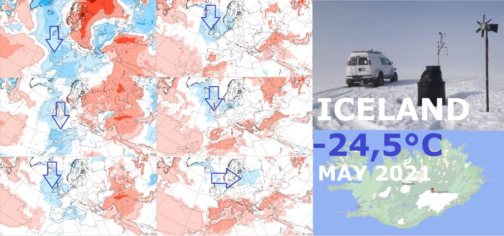 This temperature was in Iceland measured on 4. May 2021 and this air is currently flowing above northwestern Europe, which reports unseasonably May snowfall (the UK, northern France, the Netherlands, Belgium and Germany: https://mkweather.com/snowing-in-the-netherlands-on-7-may-extremely-rare-snowstorm/; https://mkweather.com/snowing-in-potsdam-berlin-germany-in-may-after-50-years/; https://mkweather.com/scotland-and-northern-england-under-the-snow-in-may-exceptionally-cold-spring-2021-continues//.