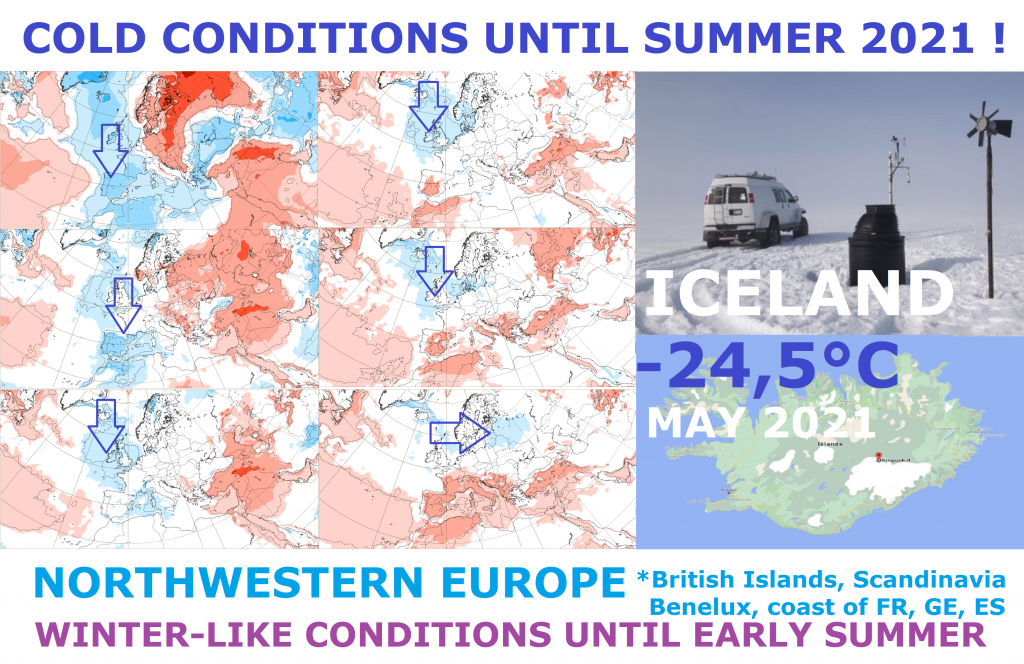 According to ECMWF, pool of extremely cold air in May 2021 will be firstly shifted from Greenland above western Europe and northwestern coast of Africa, gradually cold air stays above British Islands and in June 2021 there will be a signal for its shift above Scandinavian countries.