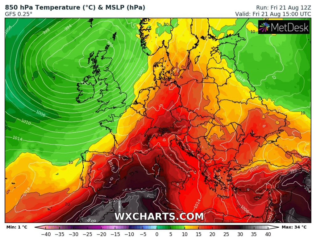 Meanwhile British Isles hit rarely summer windstorm on Thursday and Friday /https://mkweather.com/2020/08/21/the-uk-in-the-center-of-windstorm-on-friday-152-km-h-95-mph-above-ocean-the-buoys-measured-180-km-h-112-mph//, Central Europe sweated in extremely hot tropical air, in some parts with the highest maximum temperatures of the year 2020.