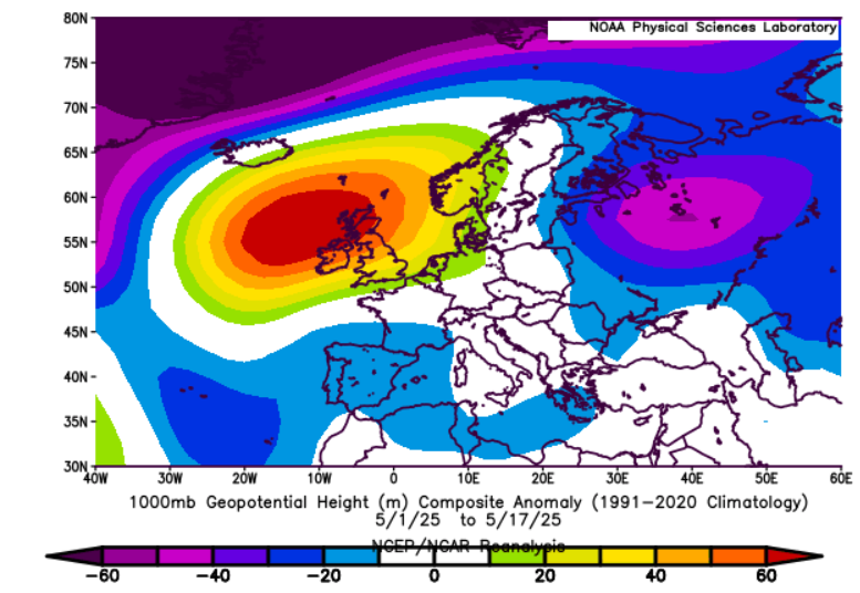 Air temperature and geopotential anomaly between Eastern Europe and Central Asia / British Islands and Ural region on 1.-17. May 2025. Source: https://psl.noaa.gov/data/composites/day/