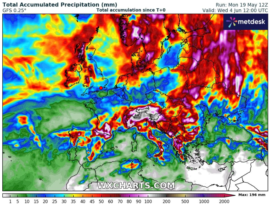 Updated accumulated precipitation in Europe until 4. June 2025. Source: https://www.wxcharts.com/?panel=default&model=gfs,gfs,gfs,gfs®ion=europe&chart=accprecip,850temp,wind10mkph,snowdepth&run=12&step=384&plottype=10&lat=51.500&lon=-0.250&skewtstep=0