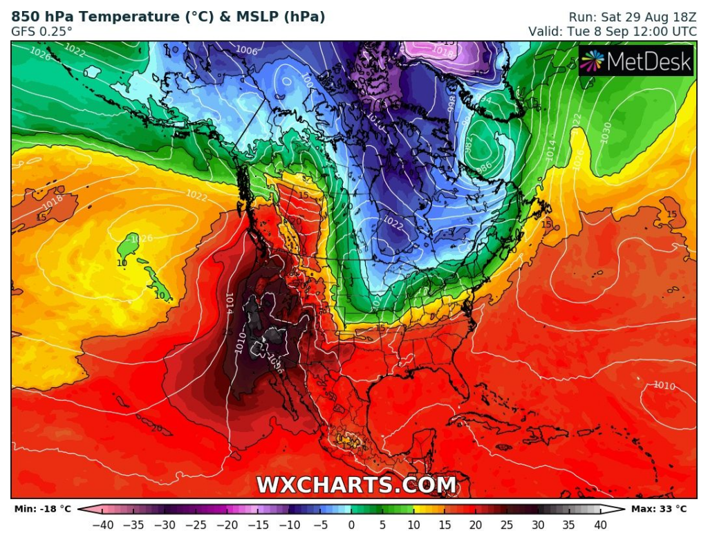 Till 5. September, advection of extremely hot air will quickly recover over West and Southwest and in eastern-half of Canada and Midwest, and gradually Northeas, Mid-Atlantic, but too South a big Arctic blast comes in the same time.