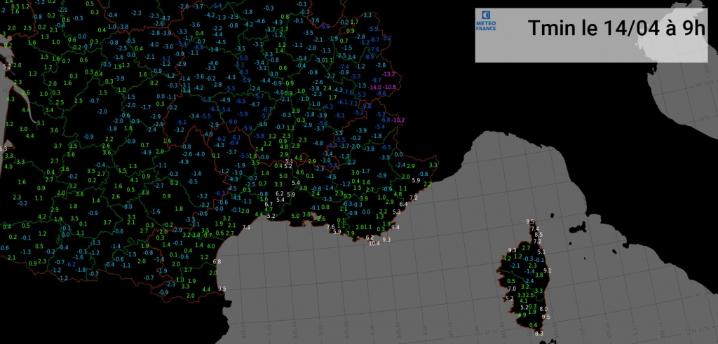 Interesting were frosts from populated, but highly elevated winter center Ristolas, France, only -10,2°C (above 1500 MASL). However, in many parts of southern France, temperatures again dropped up to -7°C according to available materials, with the next devastating frosts on Wednesday, 14. April.