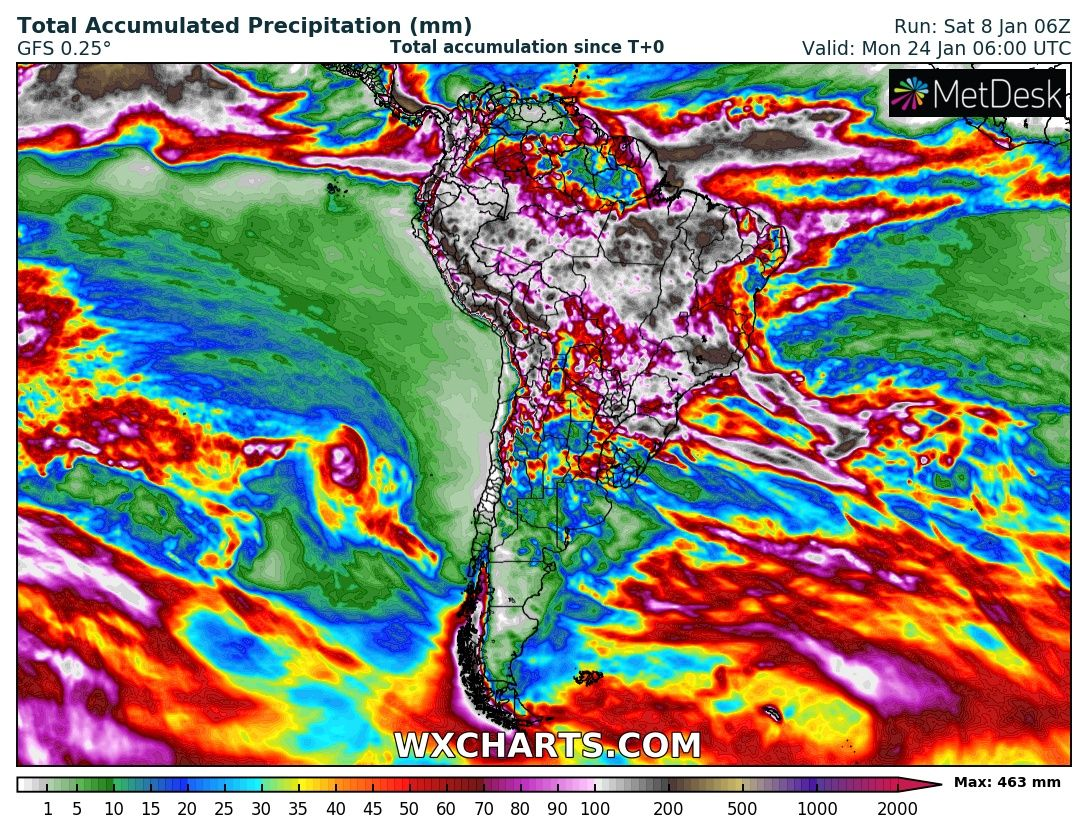In the next 16-day period, almost all of Brazil expects heavy rainfall, with possible regional floods, in some regions 200-300 mm rainfall is forecast.