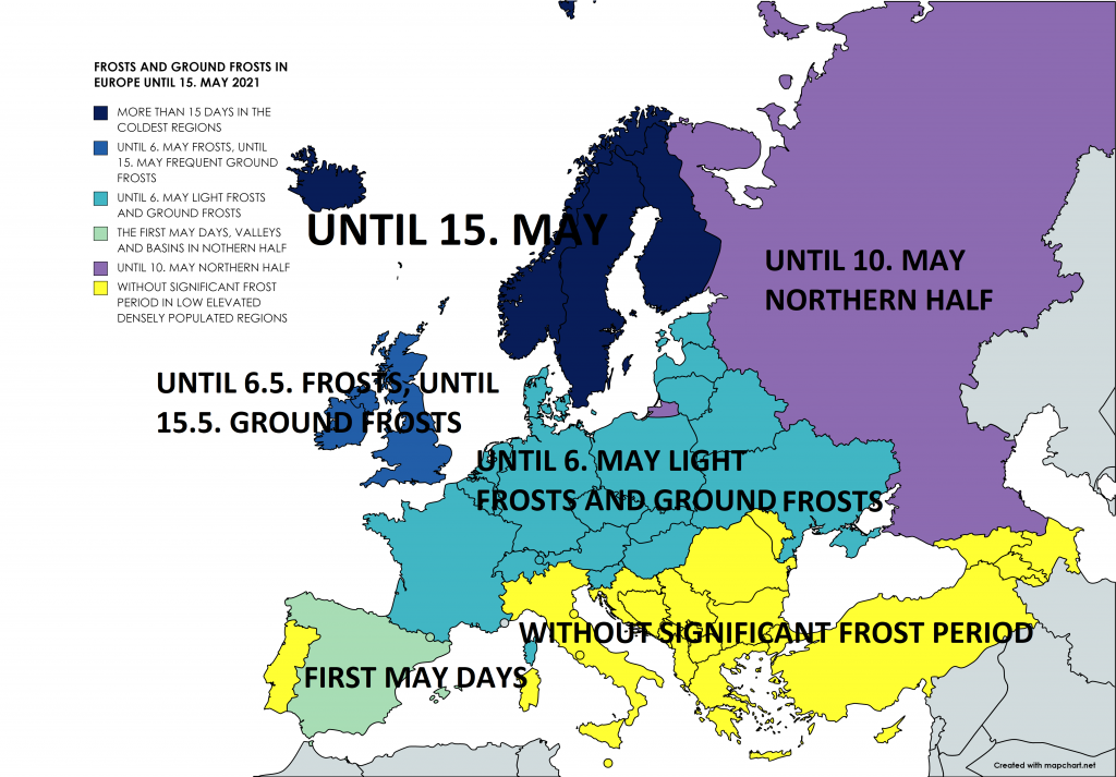 In continental Europe, light frosts and widespread ground frosts are expected until 6. May 2021, then warmer period will bring only occasionally ground frosts in basins and valleys.