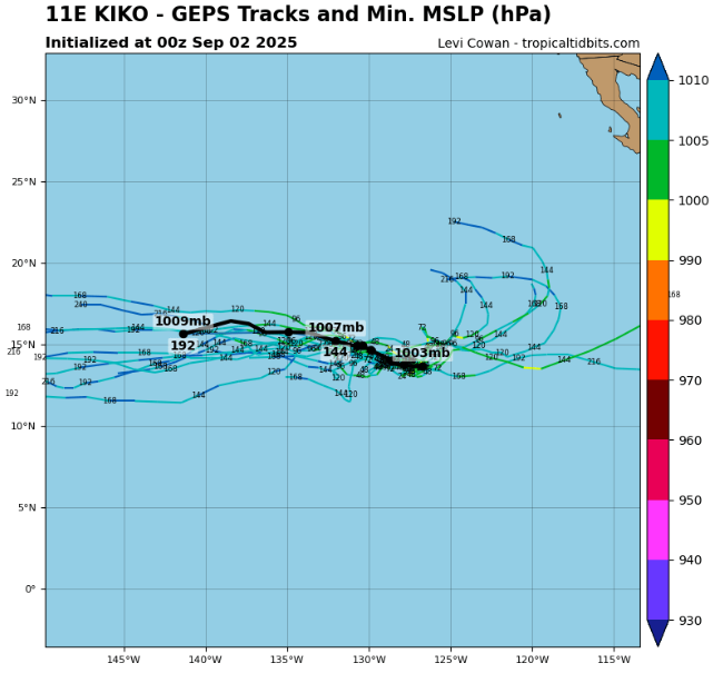 In summary, Hurricane Kiko is a compact but well-organized Category 1 hurricane with winds of 75 kt and a pressure of 987 mb. The storm is projected to remain over open waters, away from land, while possibly intensifying in the short term before weakening later in the week. Its evolution will be closely monitored by forecasters, as small hurricanes like Kiko often display rapid changes and provide valuable insight into tropical cyclone behavior.