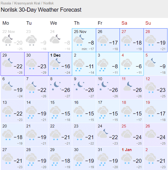 Interesting is, that the coldest times in the Arctic and Siberia (purple color in the table) are forecasted just for the next days and then only between Christmas and the New Year.