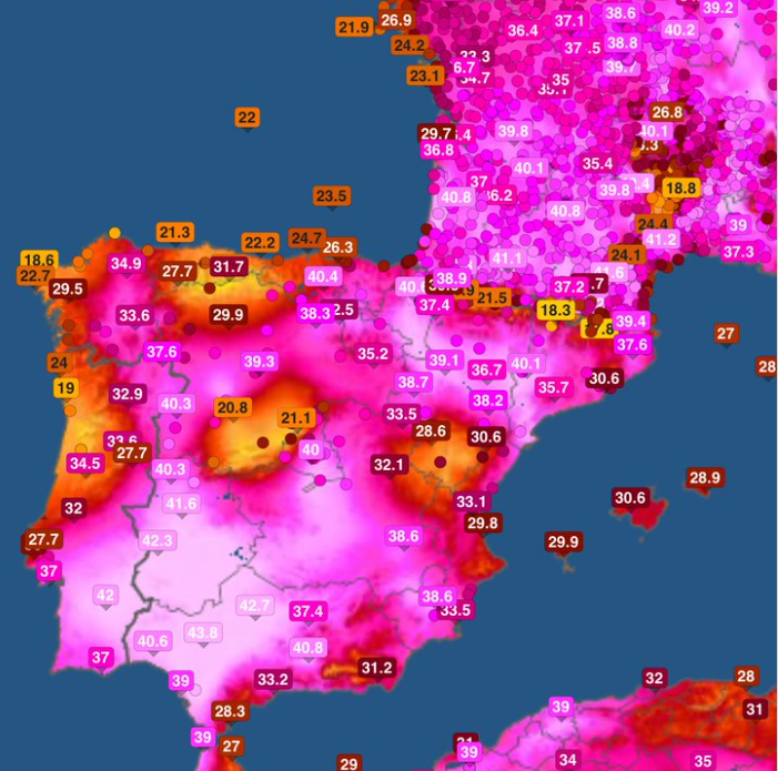 Southwestern Spain is experiencing an extraordinary and historic heatwave, with temperatures soaring to levels never before observed in many locations. On what will likely go down as one of the hottest days in the region’s recorded history, several stations in Andalusia and Extremadura posted staggering values, breaking long-standing records and pushing human endurance to the limit.