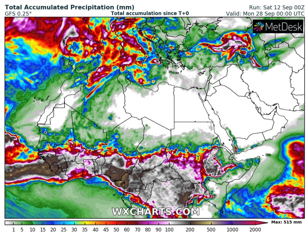 Photo and video gallery of floods in Sudan and predicted precipitation amounts until 27. September 2020 /watchers.news; bbc.com; wxcharts.com/: