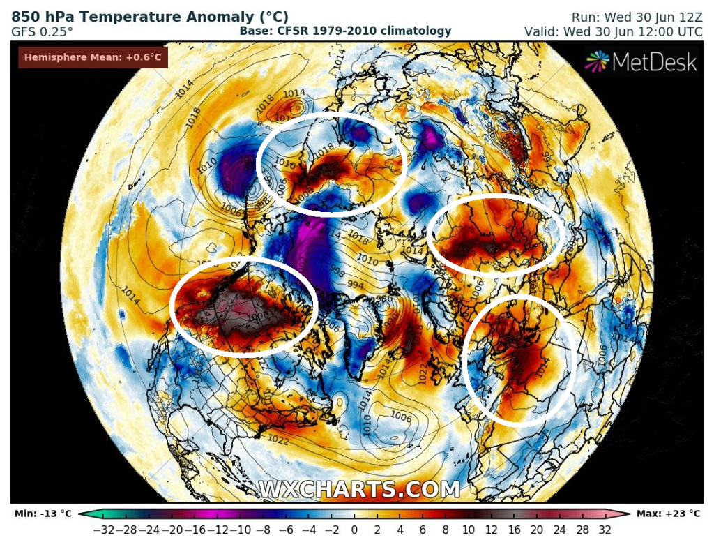 According to the Wxcharts tool, 4 regions with big positive temperature anomalies were observed around the Northern Hemisphere on 30. June 2021 – 1. Historic anomaly above Canada and the USA (west); 2. Record heatwave above eastern and southern Europe; 3. Anomaly above Ural region and 4. Anomaly above the northern Far East.
