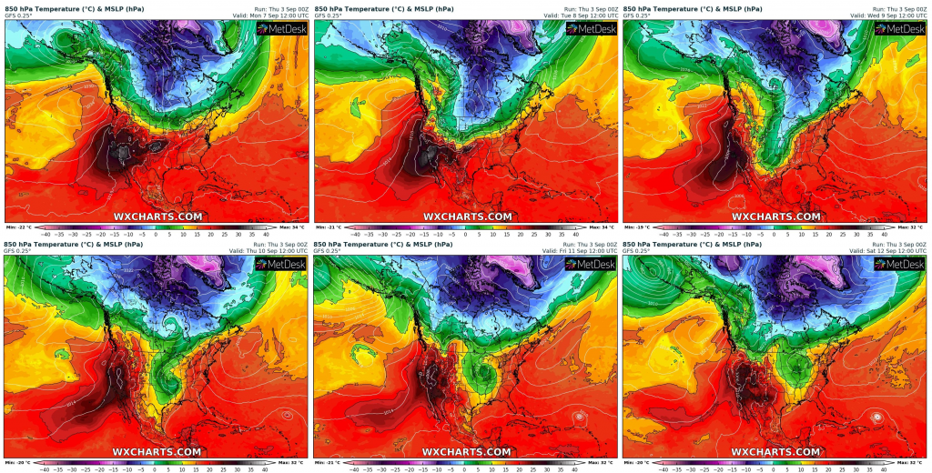 Predicted T850 hPa anomaly, precipitation (storms) and T850 hPa over North America from Monday to Saturday 7.-12. September 2020 /wxcharts.com: