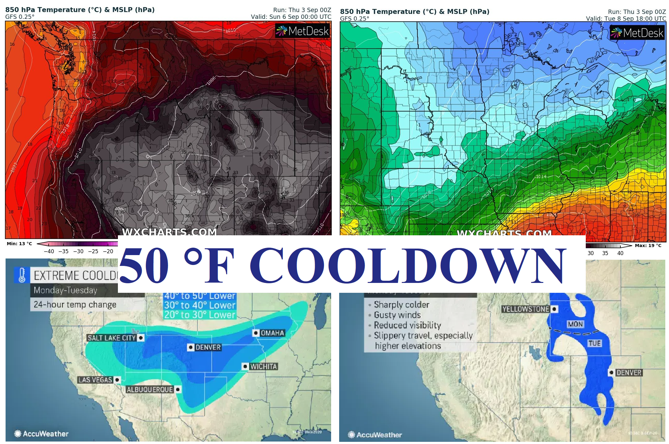 The strongest cooldown hits Colorado and neigbour states, up to 50°F for 24 hours from Monday to Tuesday!