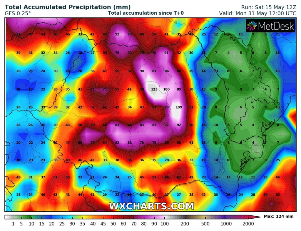 According to wxcharts.com weather tool, accumulated precipitation up to 125 mm (what should mean local amounts 200 mm) is forecasted for Carpathian parts of Romania until the end of May 2021.