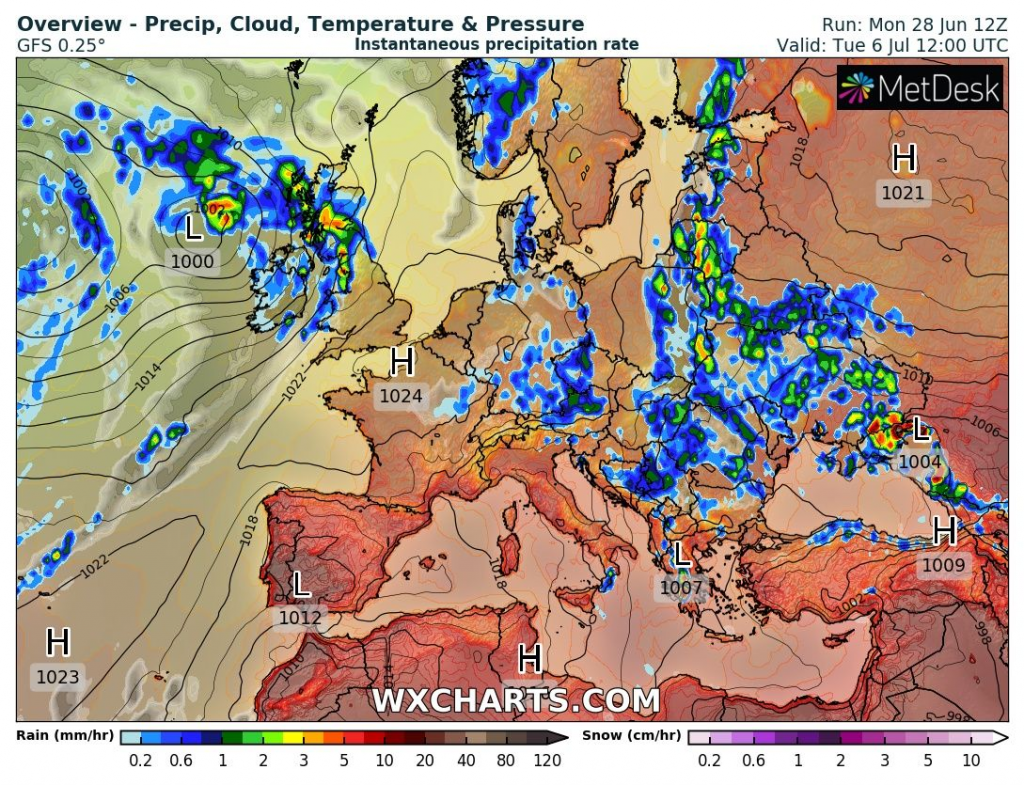 Firstly, western Europe and the Alps will be hit strongly, then around 1. July, central Europe should hit very scary storms, and then will storms gradually shifting above Balkan and Eastern Europe during the first July 2021 decade.