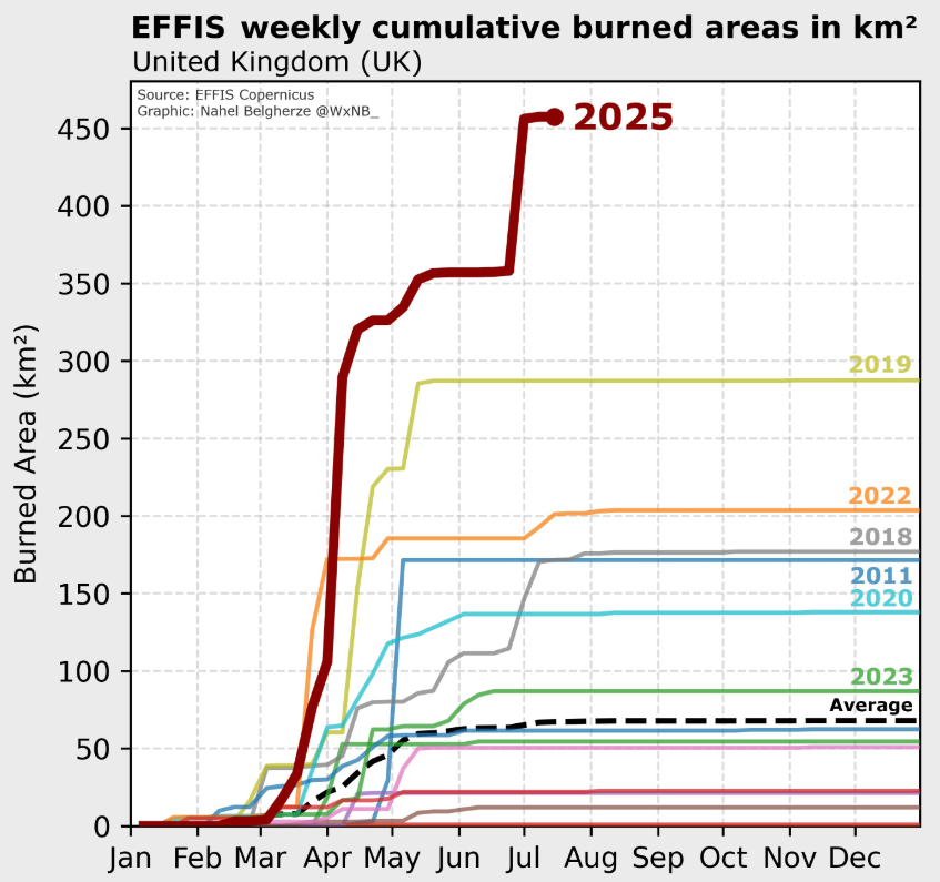 So far in 2025, the United Kingdom has experienced an unprecedented wildfire season, with more than 450 square kilometers of land burned across the country. This area far surpasses wildfire extents recorded in recent years, marking 2025 as one of the most severe fire seasons on record for the UK.