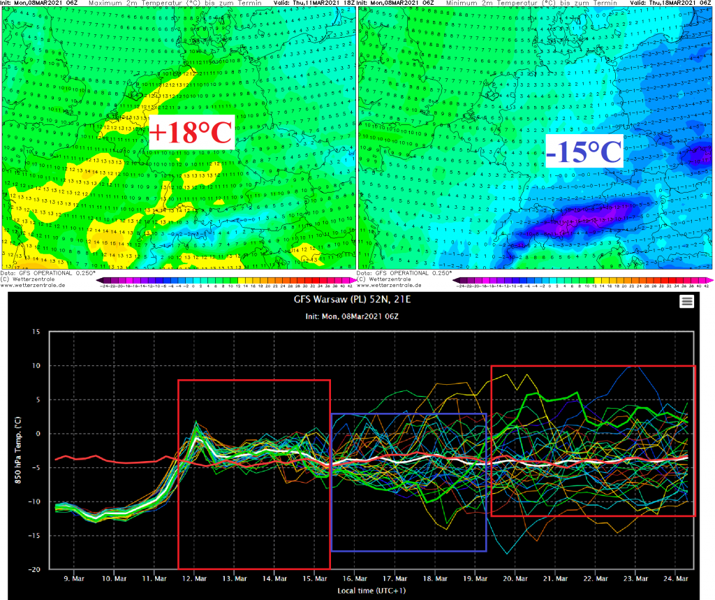 Although on Tuesday and Wednesday, 9.-10. March 2021, the next cold mornings with frosts, in basins and valleys severe, up to -15°C, are possible, on Thursday will be in western parts of Central Europe already very warm, with estimates around +18°C for parts of Germany, Benelux and France.