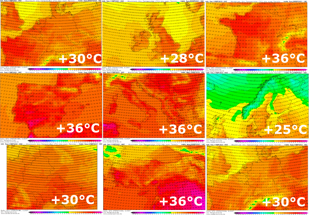In the Mediterranean, temperatures should reach up to +36°C during these periods, while some parts of Central Europe, such as Hungary, should surprise with +32°C, yet. Other parts of Central Europe are waiting during these heatwaves the last from +25°C to +30°C temperatures of the year.
