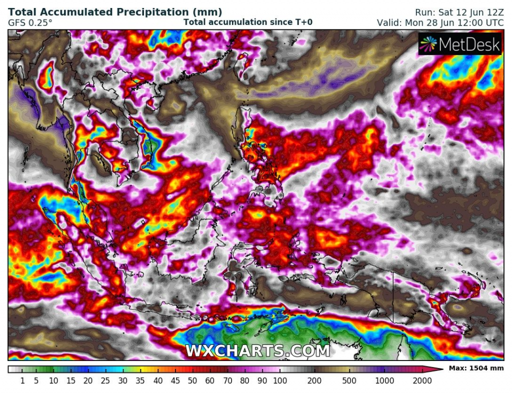From Ha Tinh and Vinh, northern Vietnam, rainfall around 250 mm on 11.-12. June 2021 is already reported, Sekong in Laos is reporting 75 mm, and parts of NE Thailand, 50 – 80 mm from Friday to Saturday between 18Z have reported.