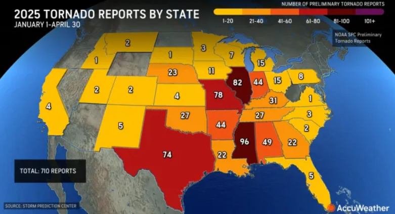 From the US is reported the strongest tornado season in 15 years (since 2011), with extreme tornado amounts in Illinois and Mississippi, then Missouri and Texas. /https://www.accuweather.com/en/severe-weather/worst-tornado-season-since-2011-two-states-top-the-list/1772158/.