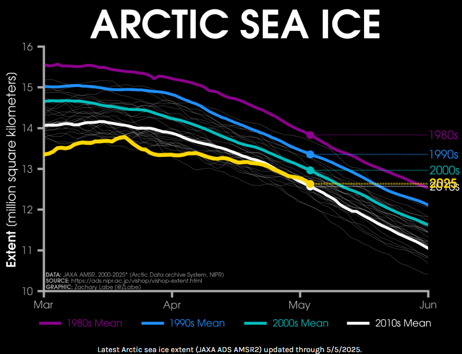 Arcitc sea ice above 2010´s average. Source: https://zacklabe.com/wp-content/uploads/2025/05/jaxa_seaice_means_v8-1.png
