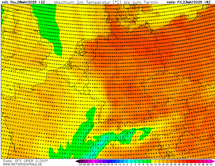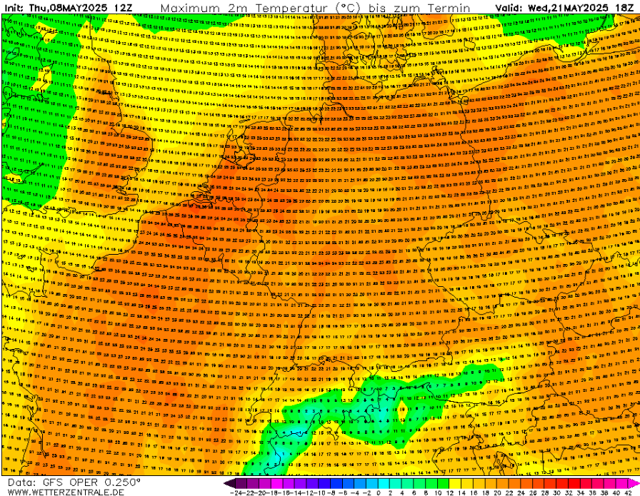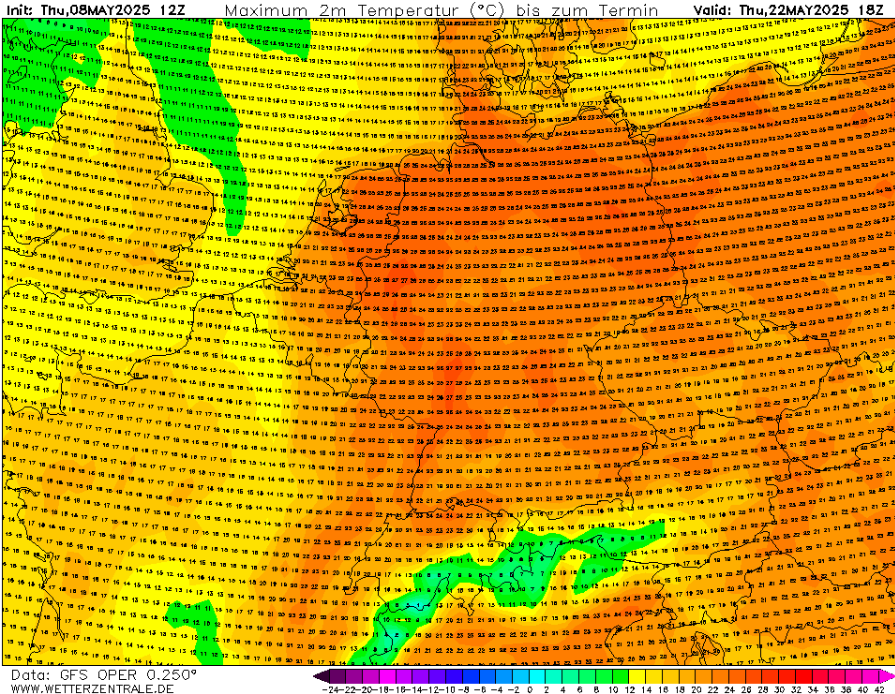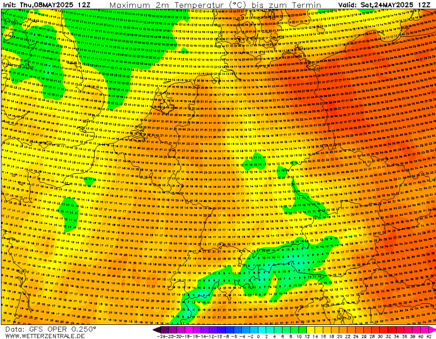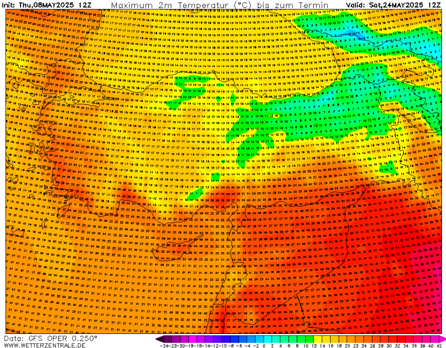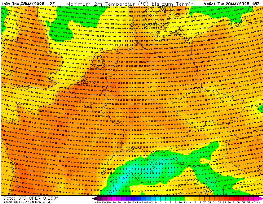 Expected heatwave in Europe around 20. 5. 2025. Source: https://www.wetterzentrale.de/en/topkarten.php?map=19&model=gfs&var=48&run=12&time=384&lid=OP&h=0&mv=0&tr=6#mapref