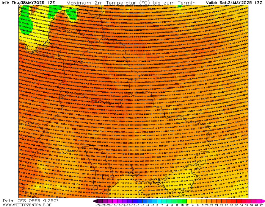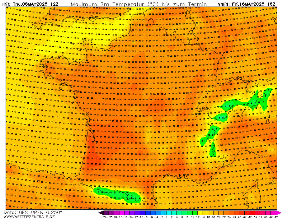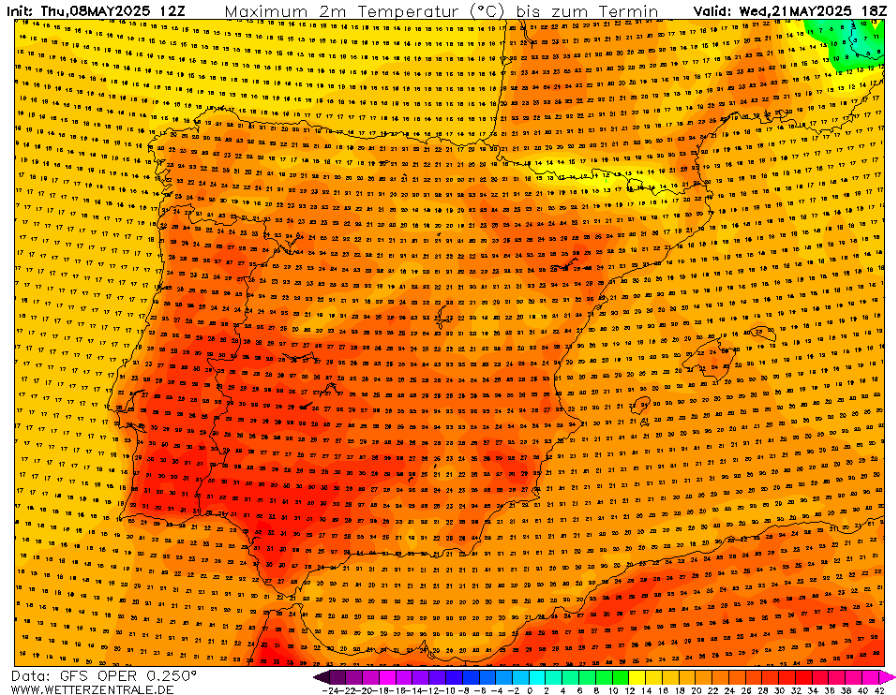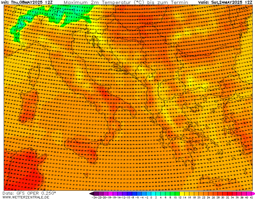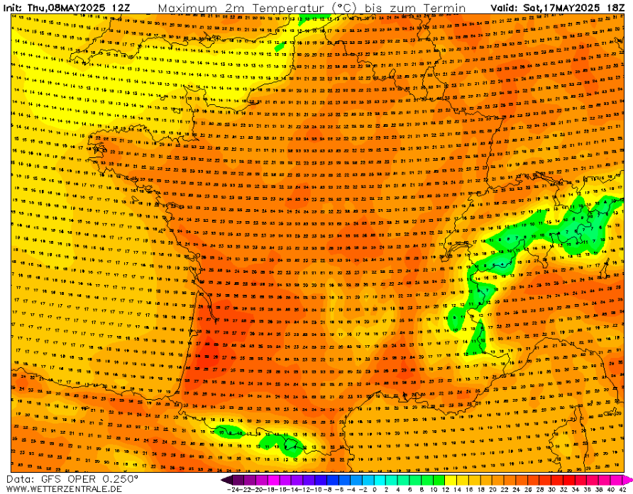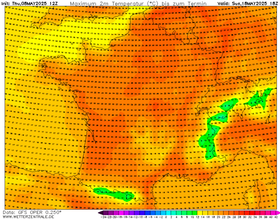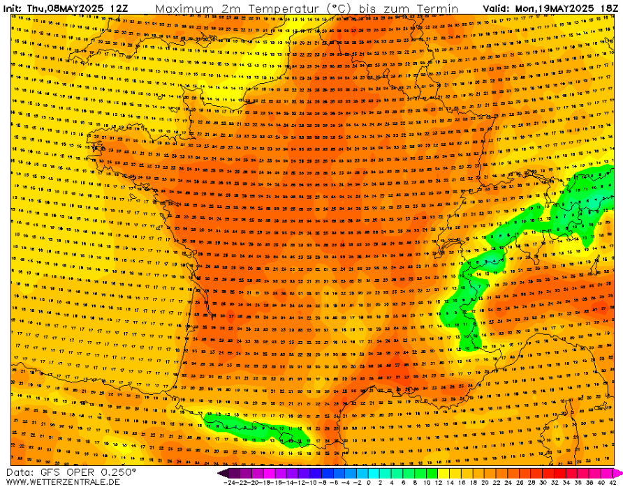 Expected heatwave in Europe around 20. 5. 2025. Source: https://www.wetterzentrale.de/en/topkarten.php?map=19&model=gfs&var=48&run=12&time=384&lid=OP&h=0&mv=0&tr=6#mapref