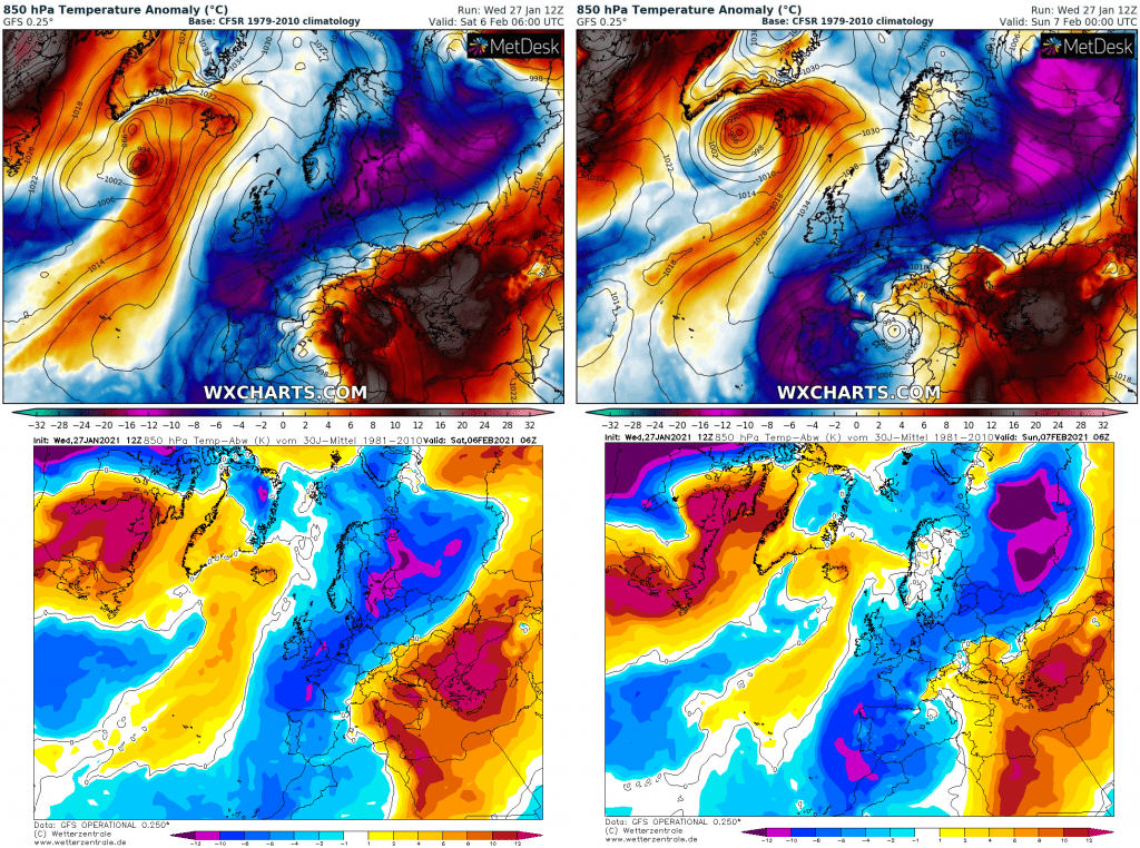 T850 hPa anomalies at the weekend 6.-7. February according to latest runs of GFS /wxcharts.com, wetterzentrale.de